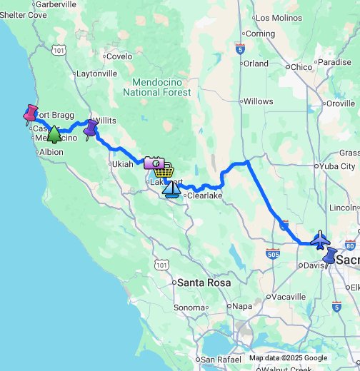 Heres a sample itinerary for a drive from Sacramento to Fort Bragg. It ends in Fort Bragg California. Total driving distance is 197.